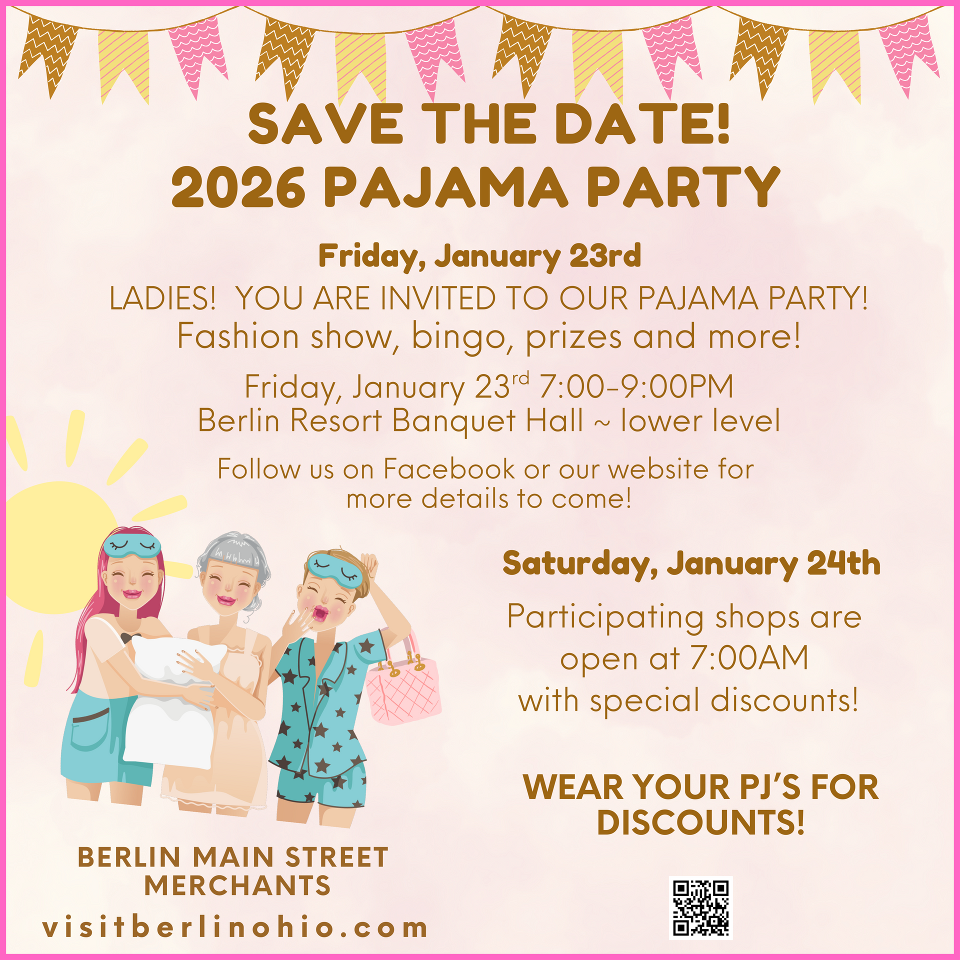 Berlin Main Street Merchants are excited to announce the 2026 Pajama Party, January 23rd-24th.